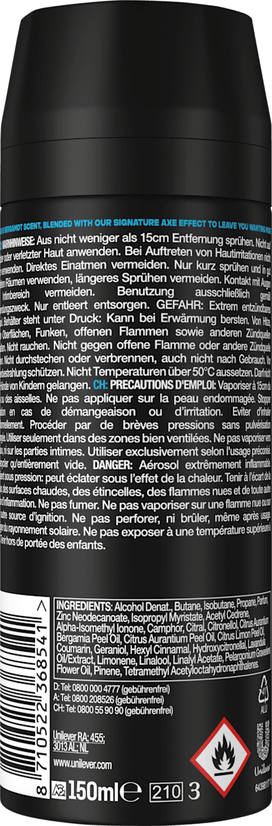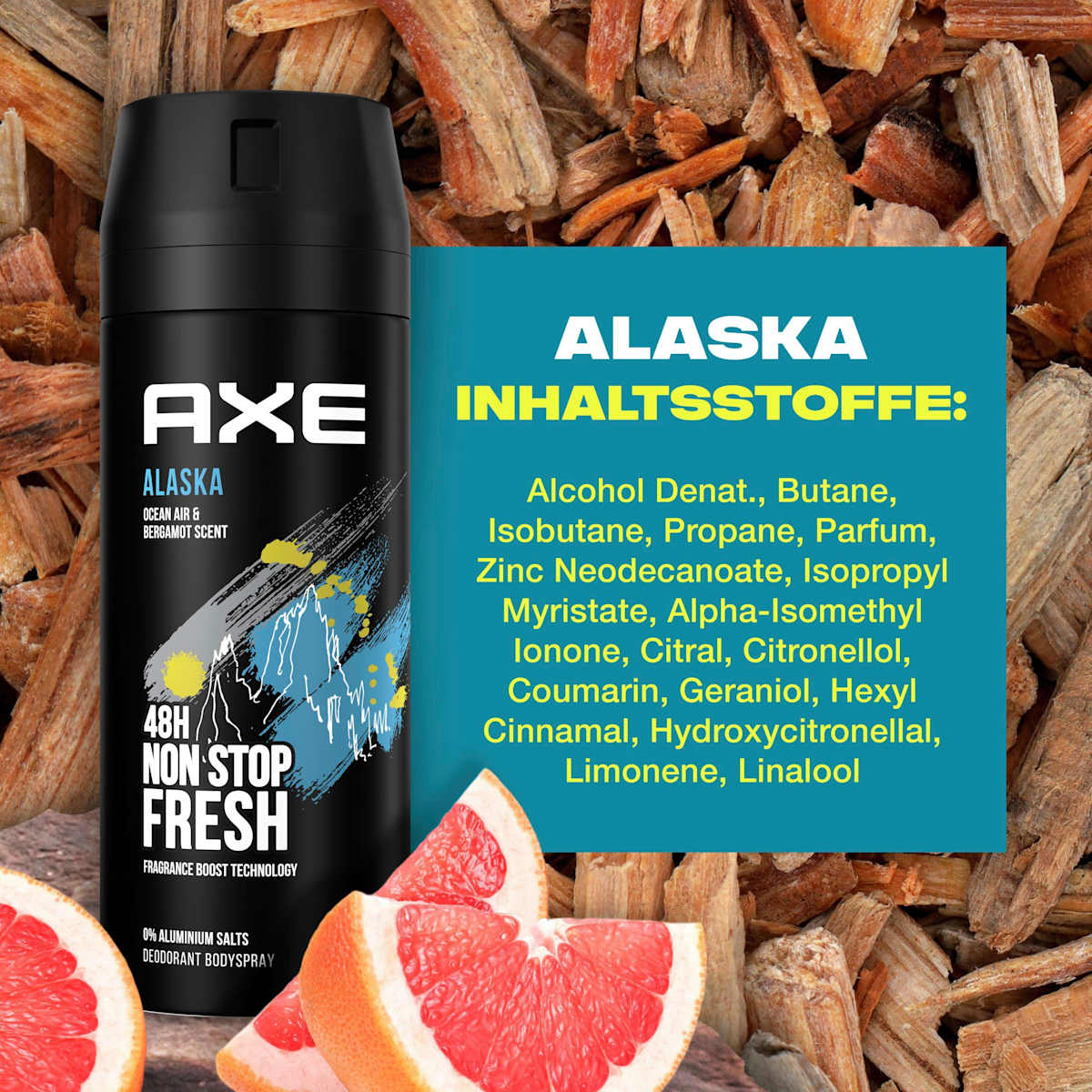 Le spray corporel AXE Alaska sans aluminium protège efficacement des autres corps. Le parfum est naturellement agréable et affirmé. La combinaison stimulante de pamplemousse et de bergamote garde celui qui le porte frais en toute situation, tandis que le melon et l'ananas apportent un équilibre, même dans les situations délicates. Le complexe masculin d'ambre et de bois de Santal s'oppose à l'accompagnement de jasmin et lavande cédrène, alpha-isométhyl ionone, camphre, citral, citronellol, huile essentielle de zeste de Citrus Aurantium Bergamia, huile essentielle de zeste de Citrus Aurantium, huile essentielle de zeste de Citrus Limon, coumarine, géraniol, hexyl cinnamal, hydroxycitronellal, huile/extrait de Lavandula, limonène, linalol, acétate de linalyle, huile essentielle de fleur de Pelargonium Graveolens, pinène, tétraméthyl acétyloctahydronaphtalènes.