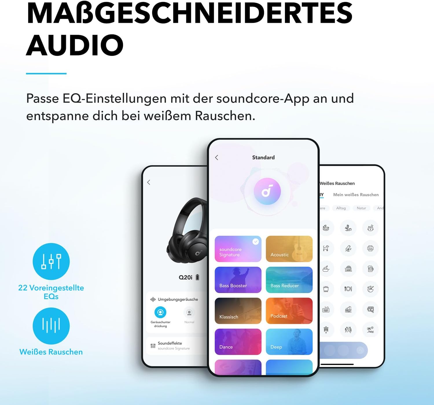 - Application de réglage de l'égaliseur : téléchargez l'application Soundcore pour affiner le son à l'égaliseur réglable et aux 22 options préréglées. Vous pouvez passer le mode original (ANC, Normal et Transparence) et vous aurez un bruit blanc.