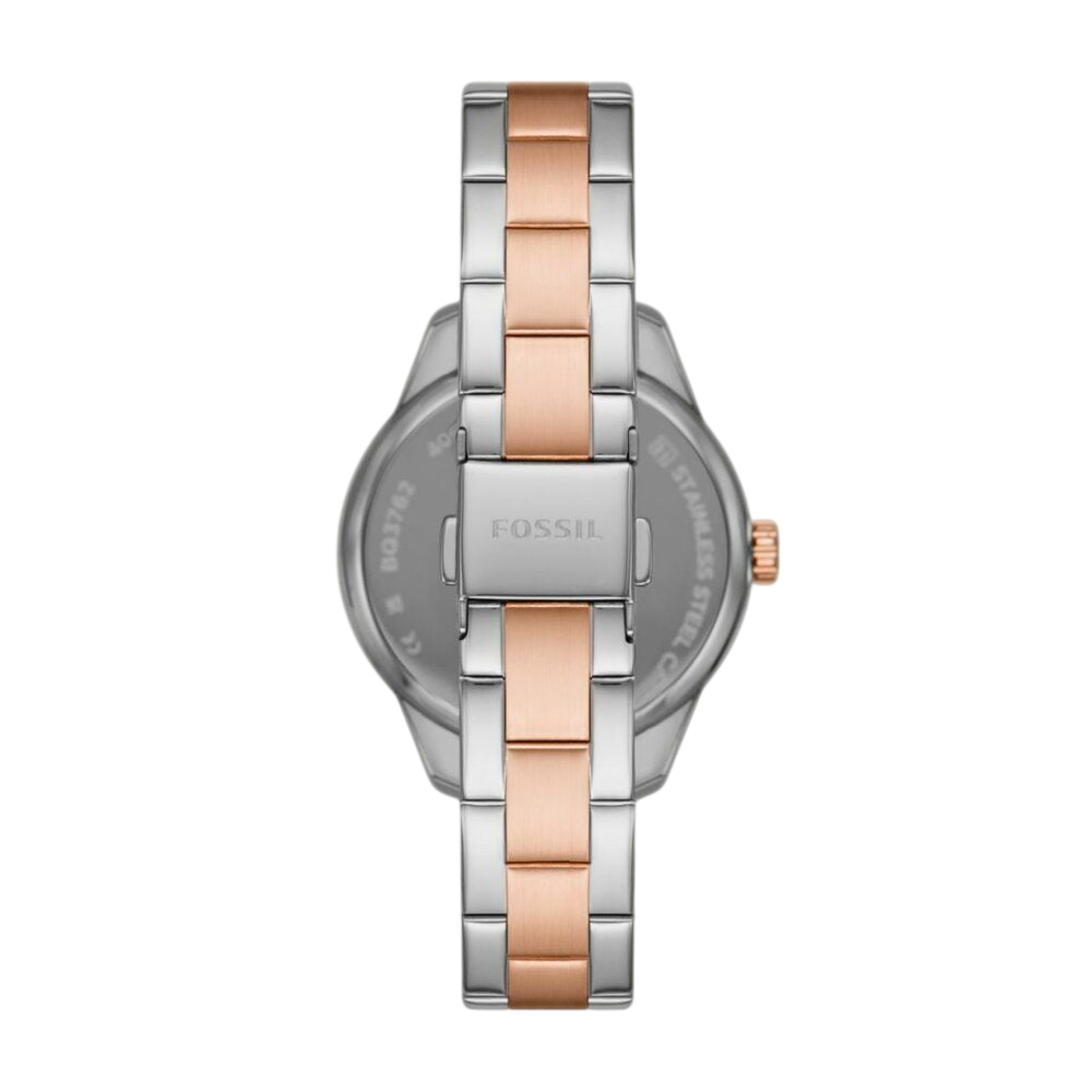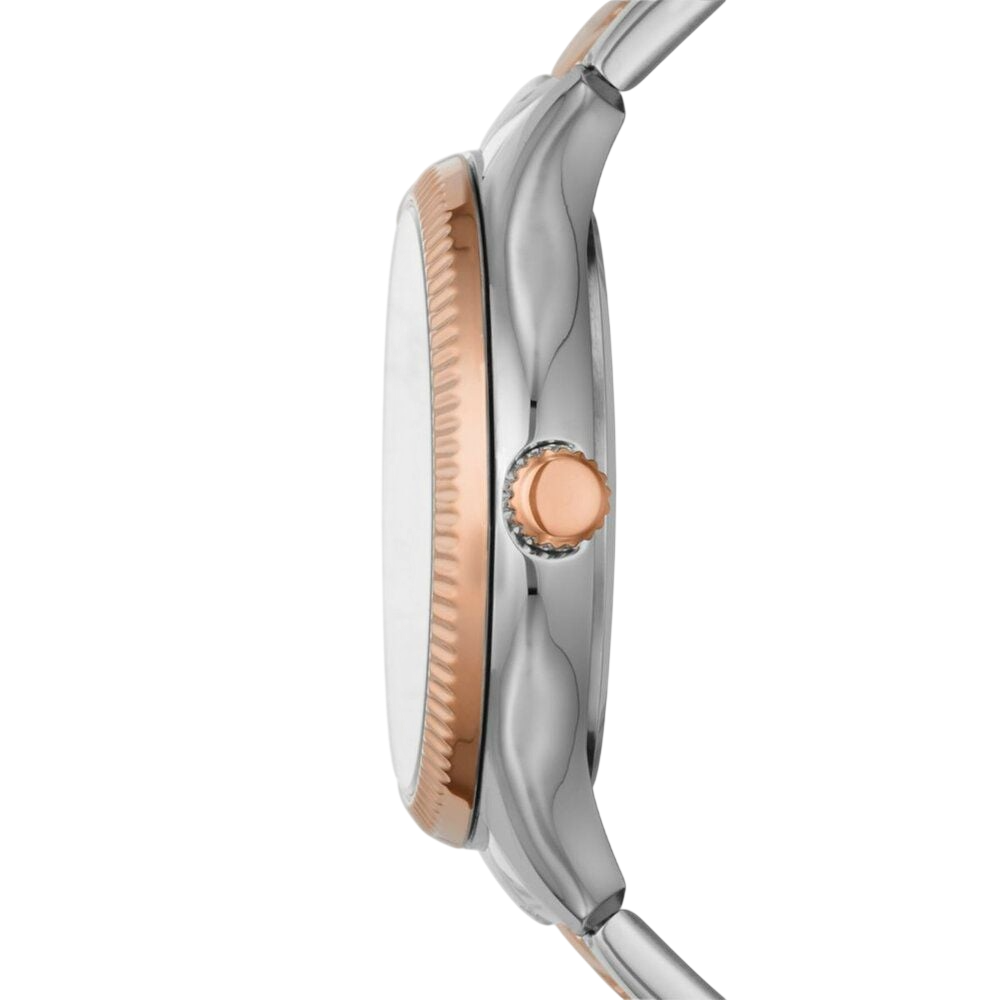 SKU: 3761Ce Rye de 36 mm est doté d'un cadran argenté soleil, d'un mouvement multifonction et d'un bracelet en acier inoxydable bicolore.