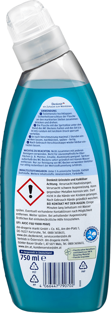 Description du produit contre les dépôts de chaux et de saleté La puissance de nettoyage de la forme de gel-formule contre la pierre d'urine de Dirt-Disposilement en pierre d'urine sans effort en pierre d'urine et des toilettes à la chaux est la solution parfaite pour le nettoyage minutieux et efficace des toilettes et des installations sanitaires. Avec sa formule puissante, il élimine sans effort les dépôts de chaux, la rouille et la saleté, de sorte que les surfaces redeviennent brillantes. Même la pierre d'urine tenace est éliminée de manière fiable, ce qui assure l'hygiène dans chaque salle de bain. L'utilisation de ce nettoyeur assure non seulement une apparence impeccable, mais aussi un climat intérieur agréable. Pour une maison dans laquelle tout le monde se sent bien, ce nettoyeur de toilettes est le choix optimal. Numéro d'article DM: 1057424gin: 40664790702 Couleur de fonctionnalité du produit: Texture bleue / cohérence / application: Pour observer les avis d'avertissement liquide: ne pas utiliser d'autres nettoyeurs. Pas adapté aux surfaces sensibles à l'acide (par exemple le marbre, l'émail, l'aluminium). Retirez immédiatement les paillettes à l'extérieur du bassin des toilettes avec de l'eau claire. Utilisez uniquement pour nettoyer les piscines de toilettes! Contenir le conteneur uniquement vide de la collection de recyclage. La pierre d'urine et l'attention du calcaire: provoque une irritation cutanée. Provoque une grave irritation des yeux. Peut être corrosif par rapport aux métaux. Ne doit pas entrer entre les mains des enfants. Lavez-vous soigneusement les mains après utilisation. Lorsque vous contactez les yeux: rincer l'eau avec de l'eau pendant quelques minutes. Supprimer les lentilles de contact existantes si possible. Rincer davantage. Si l'irritation des yeux est persistante: rattrapez le médecin / consultez un médecin. Placez le contenu / conteneur d'un système d'élimination des déchets reconnu. Contient des parfums. Ensemble d'ingrédients: Anti l'acide, colorant. Pressez la fermeture de sécurité de la bouteille dans les zones marquées et tournez-la. 2. Tenez la bouteille avec la buse de pulvérisation sous le bord du bassin des toilettes et distribuez le gel (environ 30 ml) tout autour avec une légère pression. 3. Selon la pollution, laissez-la fonctionner pendant un maximum de 2 heures, brosse, rincez, rincez - fait. 4. Laissez le capuchon de fermeture à nouveau. Provoque une irritation cutanée. Peut être corrosif par rapport aux métaux. Ne doit pas entrer entre les mains des enfants. Lorsque vous contactez les yeux: rincer l'eau avec de l'eau pendant quelques minutes. Supprimer les lentilles de contact existantes si possible. Rincer davantage. Si l'irritation des yeux est persistante: obtenir des conseils médicaux / consulter une aide médicale. Supprimer les lentilles de contact existantes si possible. Rincer davantage. Placez le contenu / conteneur d'un système d'élimination des déchets reconnu. Laver soigneusement après utilisation.
