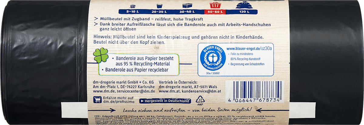 Les sacs Poubelle nature 60 l avec Cordon de serrage de Profissimo, d'une capacité de 60 litres, sont composés à 85% de plastique recyclé et sont très pratiques et polyvalents.
